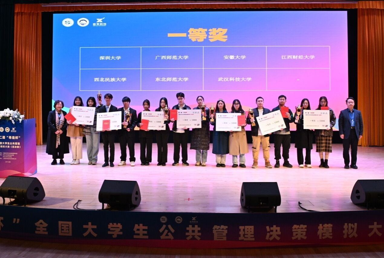 武科大网讯(通讯员冯佳乐)10月29日,我院行管2102班麦权煜、行管2201班庹桂英、公管2103班余重骁于东北大学参加的第二届“寻是杯”全国大学生公共管理决策模拟大赛(总决赛)荣获一等奖,由我院老师王哲、闫明明带队指导。