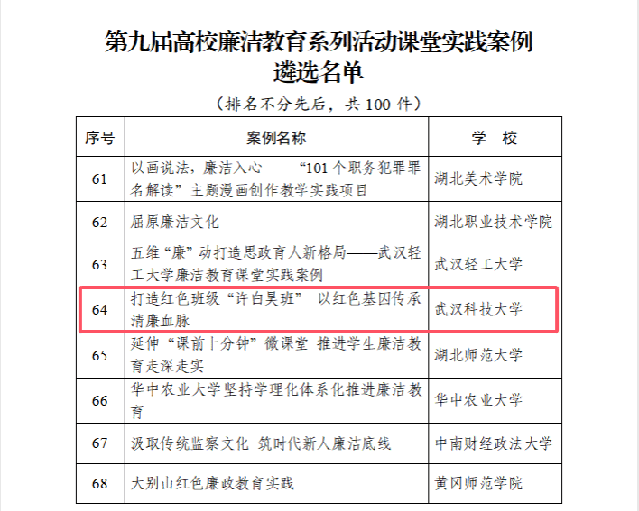 武科大网讯 近日,教育部公布了第九届高校廉洁教育系列活动评选结果。由我校WilliamHill威廉希尔杜逸涵等报送的作品《打造红色班级“许白昊班” 以红色基因传承清廉血脉》入选课堂实践案例遴选名单。