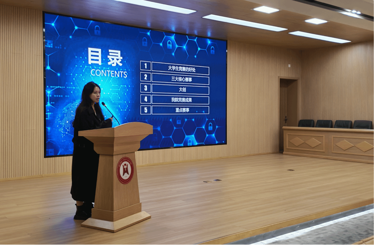 林淳宜围绕“以赛促学,启智未来”的主题,从“大学生竞赛的益处”切入,通过讲解我校学生可参与的三大核心赛事、四个重点赛事、“大创项目”的内容与申报条件,以及我院在竞赛中取得的显著成果,使学生对竞赛有了初步而全面的了解。