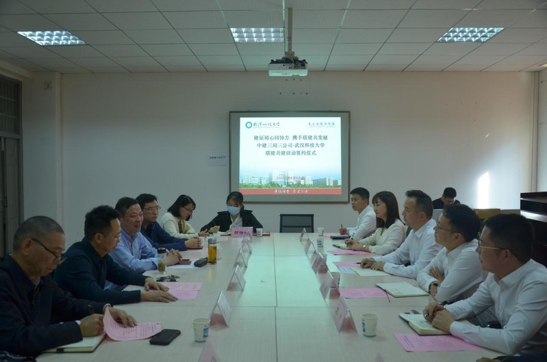 武科大网讯 (通讯员杨言蕊 见习记者黄为 摄影田畅) 10月19日下午,中建三局三公司同文法与经济学院开展“建证初心同协力,携手联建共发展”联建共建活动暨党建共建协议签约仪式。中建三局三公司人力资源部(干部人事部)部长程亚军,副部长王星、严青,文法学院院长袁年兴、党委书记张继才等出席活动。文法学院副院长贺尊教授主持签约仪式。