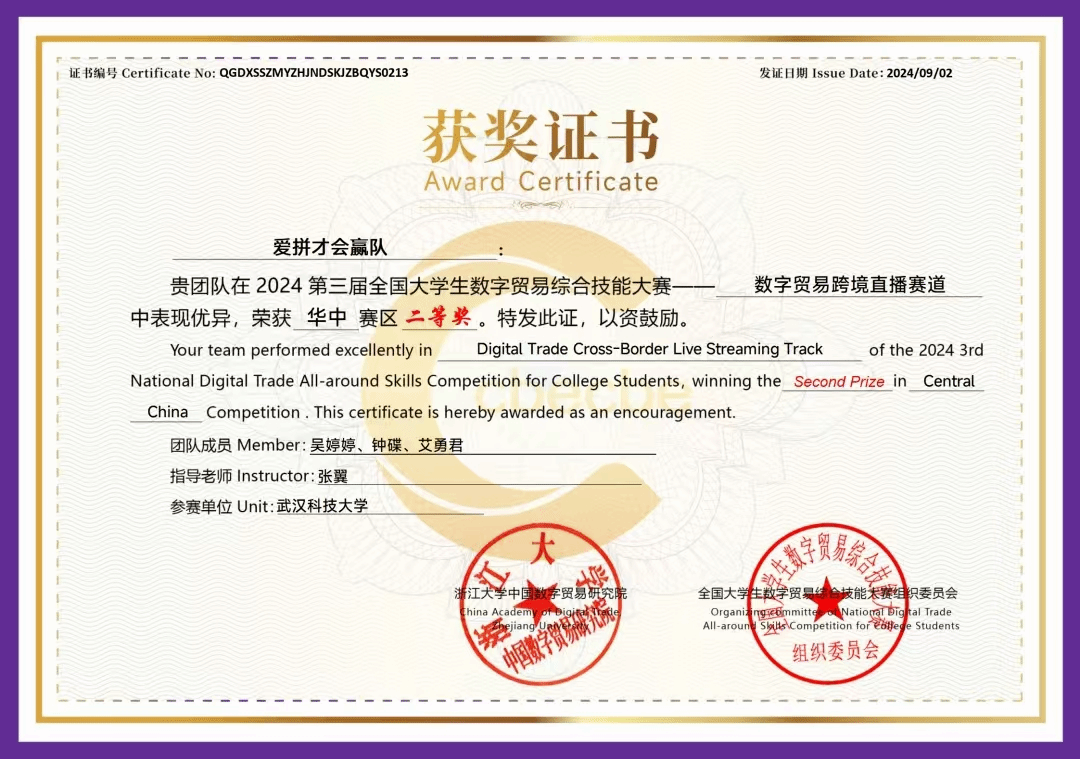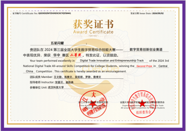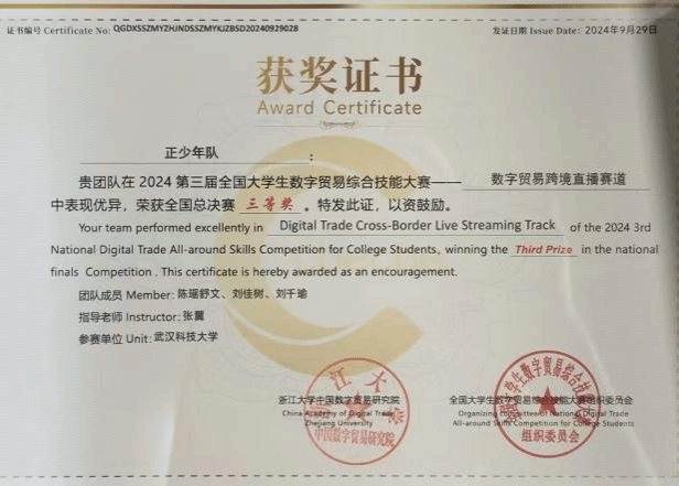 在区域赛中,我院共有四支队伍获奖,两支队伍成功晋级总决赛。其中,由国贸2203班吴婷婷为队长的爱拼才会赢队(指导老师:张翼)荣获跨境直播赛道华中赛区二等奖;由研究生王文勤、陈雅文、吴铭明、罗静和投资2302班詹博文组成的五星闪耀队(指导老师:贺嘉贝、谢韵典)荣获数字贸易创新创业赛道华中赛区二等奖。