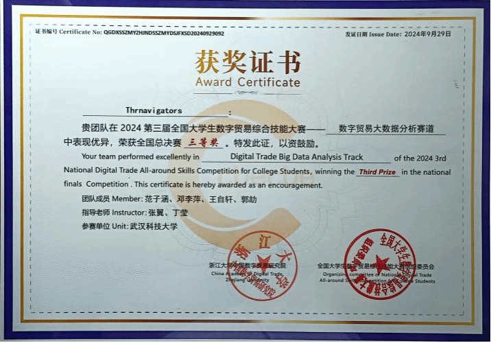 2024年9月29日,第三届全国大学生数字贸易综合技能大赛全国总决赛颁奖典礼在浙江大学紫金港校区落下帷幕。WilliamHill威廉希尔5名学生在贺尊和丁莹老师带领下参加了总决赛,并喜获佳绩。