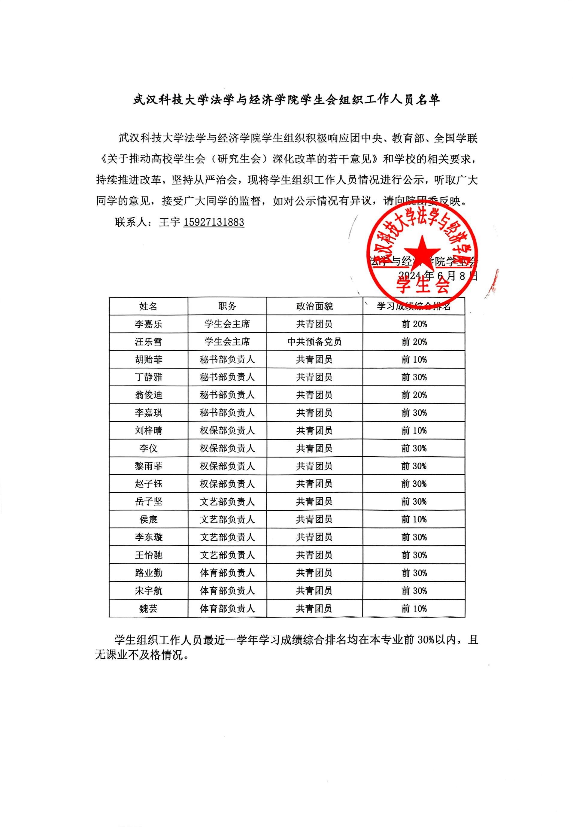 WilliamHill威廉希尔学生会组织工作人员名单