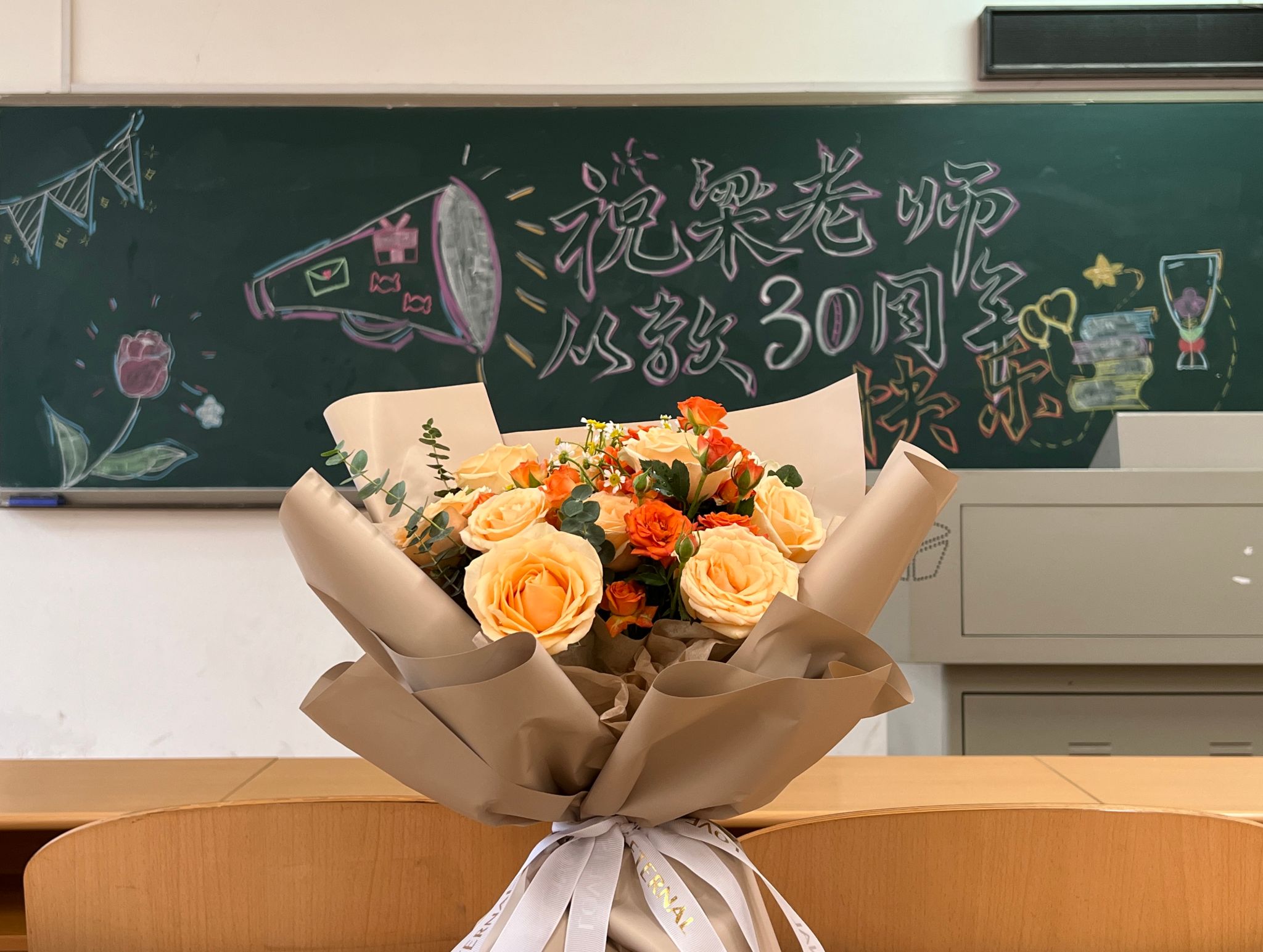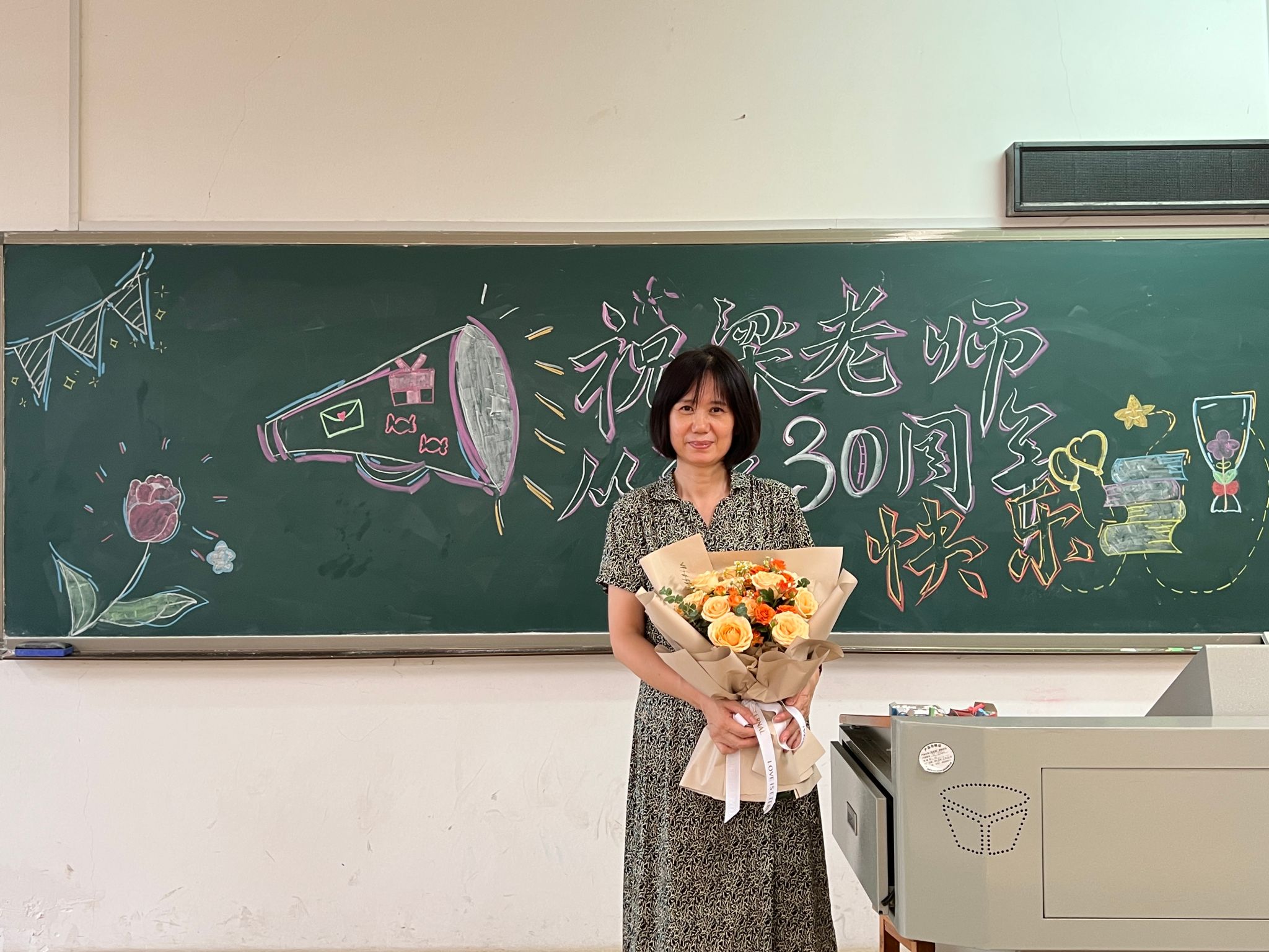 在本次民法学课程开始前,我院2022级辅导员王宇特地与法学2022级两个班的班长联系,向学生们提议为梁东新老师准备此次惊喜。法学2202班班长梅婷婷对此激动道:“在得知今天是梁东新老师从教三十周年纪念日后,我们便开始组织班上同学在下午民法学上课前画好黑板报并买好花束并提前向班上同学们说明此情况,和大家约定好在上课时给梁老师齐声送上祝福。”