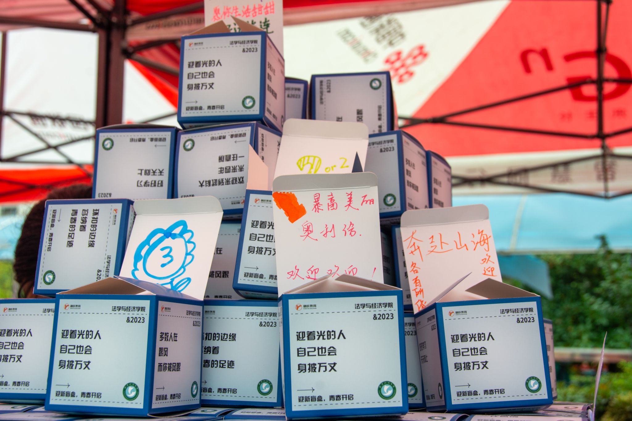据悉,此次的文创盲盒由我院2023级的各班班助以及众多学生一同参与创作完成,盲盒中分别设有一二三等奖项和参与奖,每个盲盒内还包括有我院2021级学生亲手写下的祝愿、寄语和定制小饰品,新生们可以通过在留言本上进行留言即可参与盲盒的抽取。