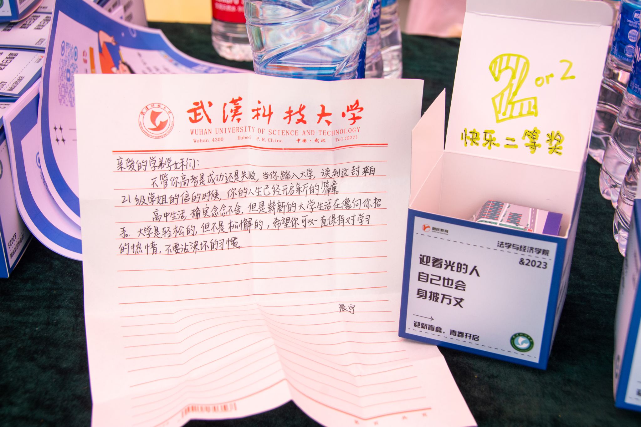 “望你谦虚,谨慎,不骄不躁又热情积极,在投身于知识的海洋时亦能结识到灵魂的挚友。”我院经贸2302班新生郑小宇抽取到的盲盒中这样写道。在认真看完这封信件之后,郑小宇感叹道:“这封信的字字句句间都透露着对我们新生的关怀和希望,这是作为即将经历四年大学生活的我们收到的最暖心的礼物。”同时她也表示,在今后的大学生活中,她会时常记起学姐的话,走好接下来的每一步。