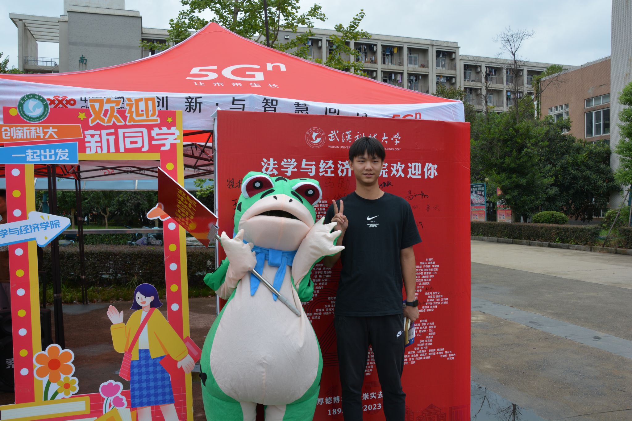 在迎新现场,我院路演青蛙的身影吸引了众多新生的目光,身着青蛙玩偶的学生会主席陈思韵伴着动感欢快的音乐跳起舞蹈,赢得新生的一片喝彩。舞蹈结束后,许多新生纷纷与“网红青蛙”合影留念。“虽然玩偶服又笨重又不透气,但是听到新生们的欢呼与笑声,疲惫和闷热的不适感都消散了。”陈思韵希望能以这样欢快的方式迎接新生们的到来。