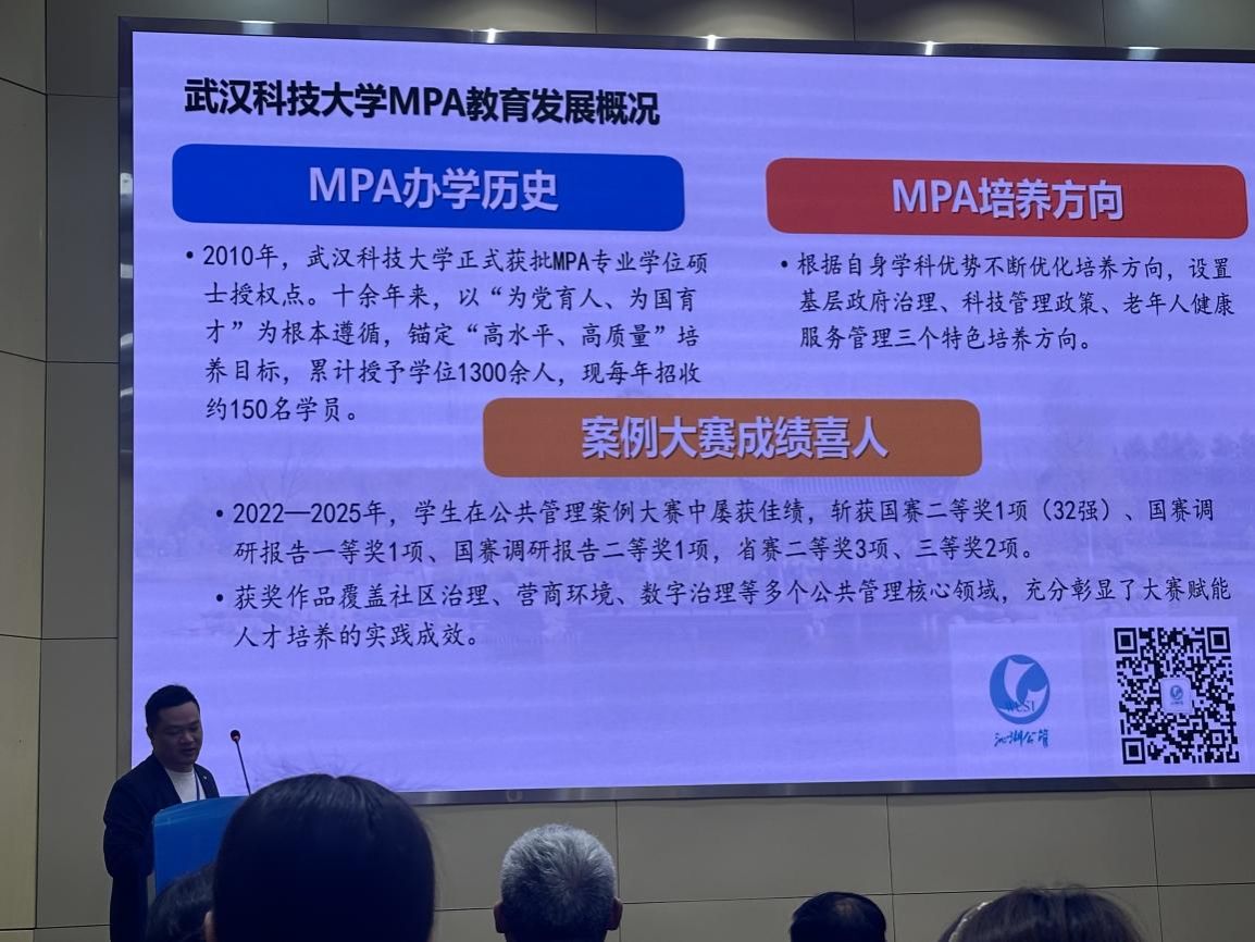 上午的专题报告环节,MPA中心主任王哲以“以案例大赛为抓手,推进MPA教育高质量发展”为题,从学科根基、师资协同、培养体系、保障机制四方面,系统分享了我校MPA教育的发展路径。我校依托公共管理湖北省级重点学科与“大数据与省域治理”特色学科群支撑,构建“课程教学—实践积累—大赛锤炼”闭环培养体系,2022至2025年间斩获国赛二等奖1项、三等奖1项,国赛调研报告一等奖1项、二等奖1项,省赛二等奖2项、三等奖2项。