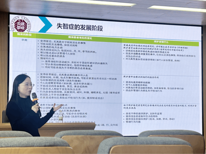 紧接着,唐咏教授深入讲述了她们团队以失智症为核心议题的田野调查研究成果。她强调照护失智老人对于家庭而言,是一项既漫长又充满挑战的重任,往往使照顾者承受着身心的双重压力,极大地削弱了他们的生活质量。唐教授通过细致入微的视角,从不同经济背景的家庭出发,讲述了十五年失能失智照护之路,八旬空巢教授夫妇以及“三人半组合协作式”养老。虽是不同人生,但是相同地图,映射出失智家庭面临的普遍挑战。她着重指出,当前失智老人照顾者所面临的困境,不仅体现在家庭内部照护资源的匮乏与压力的重负,还体现在社会服务体系的不足与支持的缺失,形成了家庭照顾与社会服务交织的双重难题。